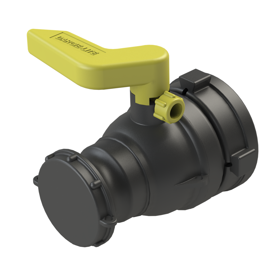 2" 'DARCIE-LITE' IBC ball valve, S75X6 female buttress in-let x 2" Camlock adapter with 2" pipe thread male C/W dust cap, BLACK,, YELLOW handle CPP logo G/P/P