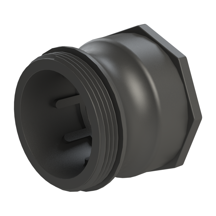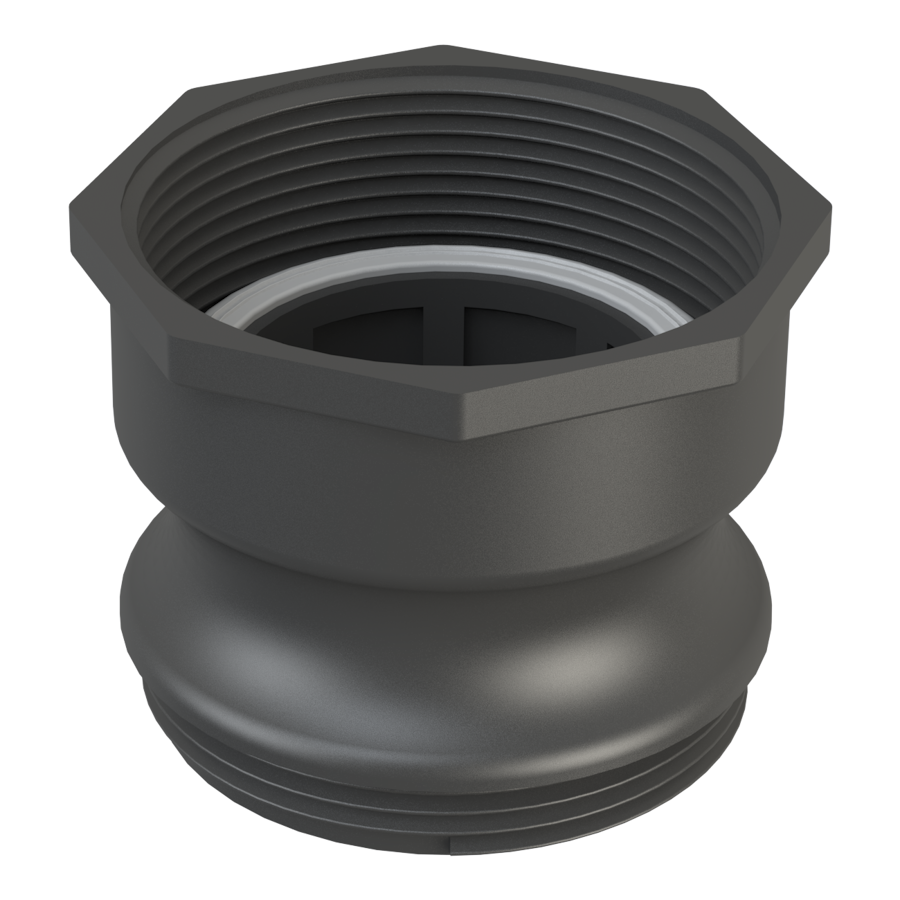 IBC tank valve adaptor, 2’’ Part ‘A’, 2’’ short Camlock male adaptor with external 2’’ BSPP short male thread for attaching a low-profile female dust cap. The other side of the adaptor is a 2’’ NPS female fine thread with gasket seal, material is food grade polypropylene.